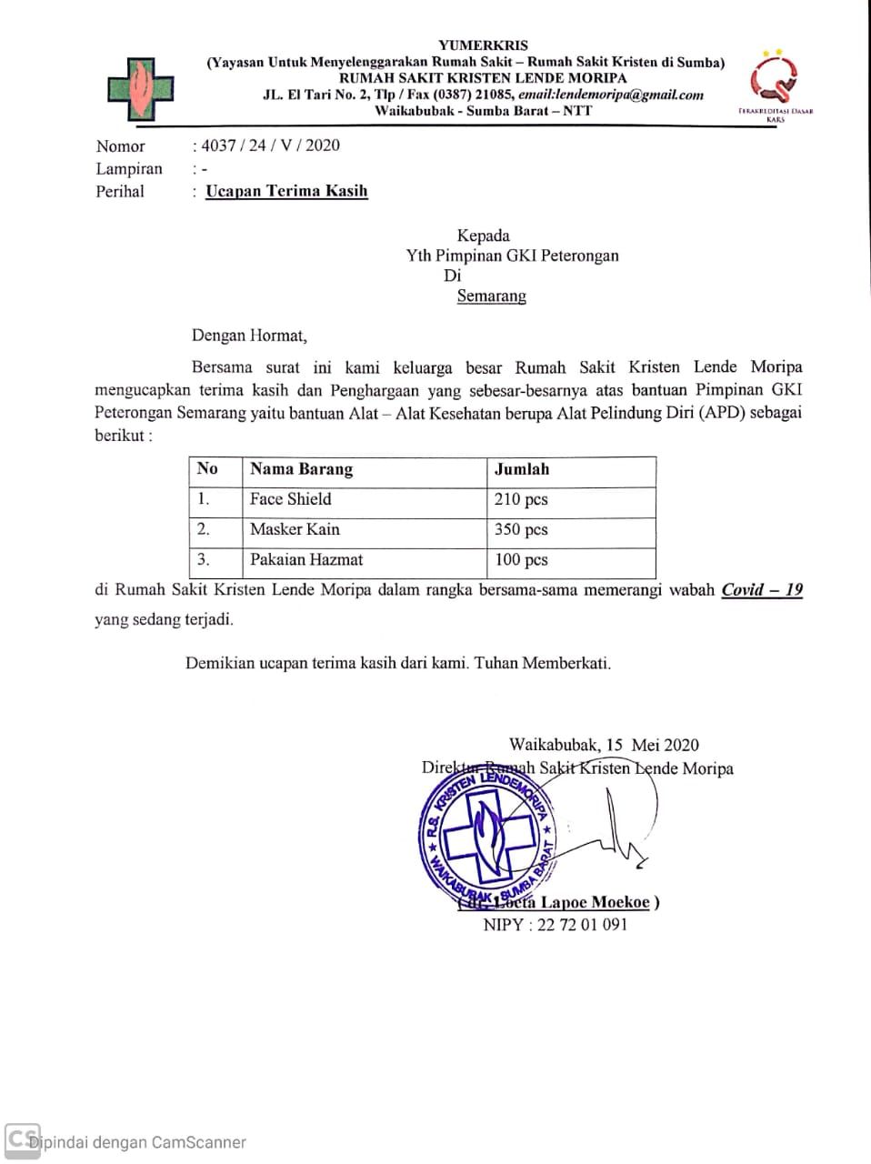 Penyerahan APD untuk RS Kristen Lindimara & Lende Moripa Sumba